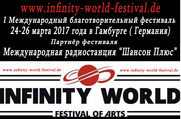 24-26 марта 2017 года в Гамбурге стартует I Международный благотворительный фестиваль « Infinity World Festival of Arts » – масштабный проект при поддержке Международного благотворительного общества культуры „Sternenhimmel e.V. “ г. Гамбург (Германия).Яркая и насыщенная программа фестиваля включает концерты, выставки и мастер-классы а также конкурс юных и молодых исполнителей.Обладателям Гран-при и лауреатам 1 степени во всех категориях