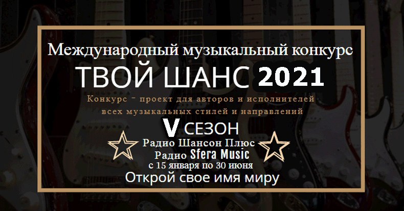 Радио "Шансон Плюс" и радио " Sfera Music" ПОЗДРАВЛЯЮТ ПОБЕДИТЕЛЕЙ МЕЖДУНАРОДНОГО МУЗЫКАЛЬНОГО КОНКУРСА "ТВОЙ ШАНС 2021". Пусть Ваша звезда сияет еще ярче. Ваше имя будет еще более узнаваемо. Ваши песни услышали и полюбили еще больше жителей планеты Земля. Радости вам и еще больших творческих взлетов и побед! Ждем вас и в 2022 году на нашем Конкурсе и Проекте!