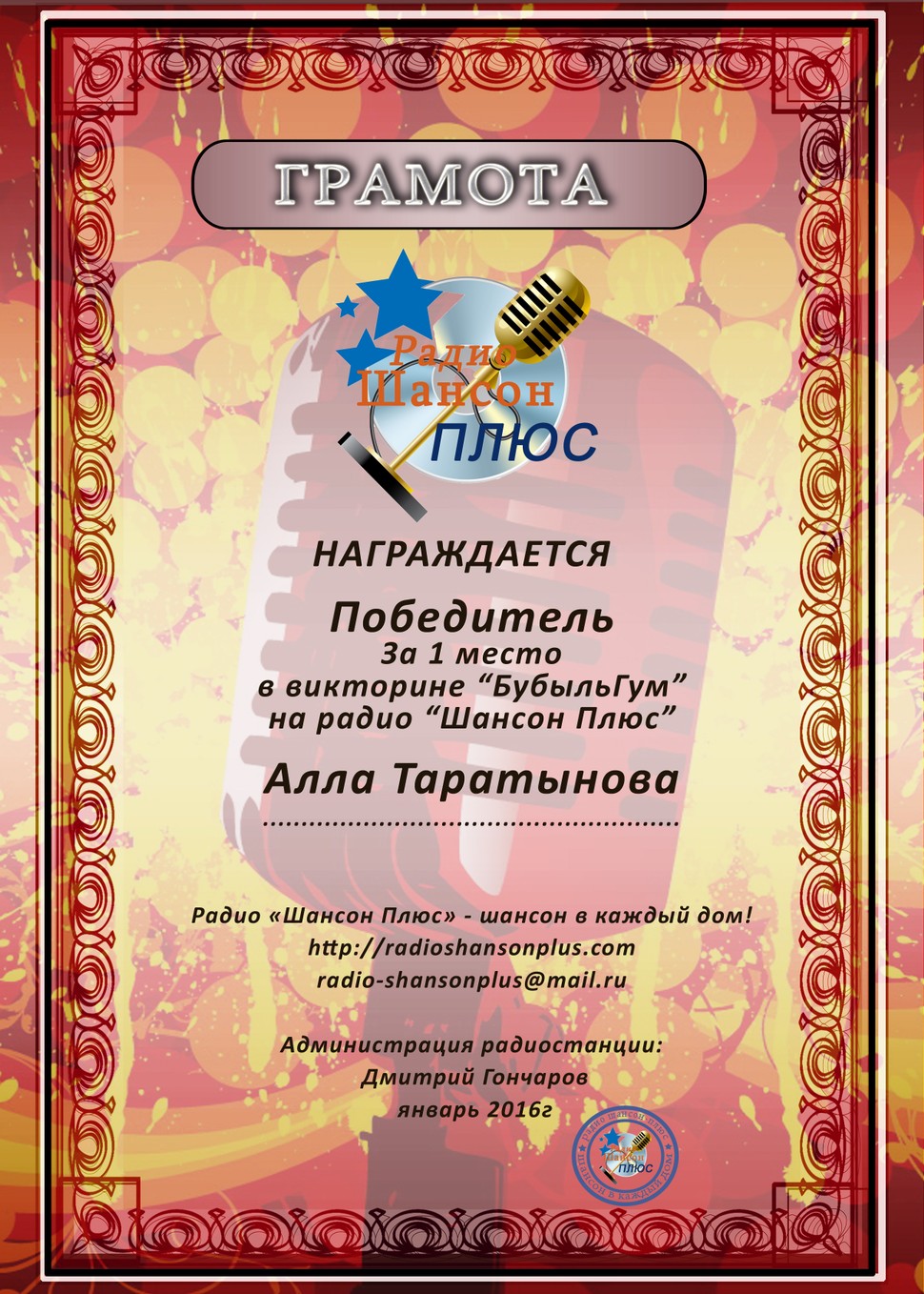 От всей души поздравляем победителей! Желаем им здоровья, счастья и новых побед в конкурсах и викторинах радио "Шансон Плюс".