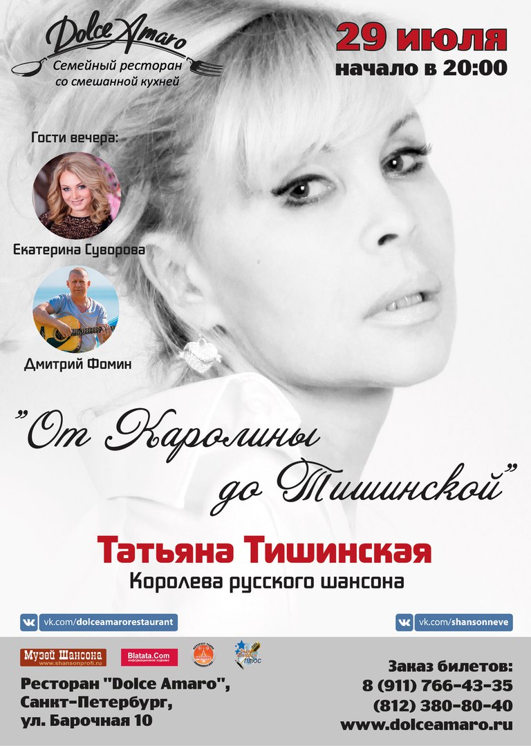 29 июля Татьяна Тишинская с сольной программой "От Каролины до Тишинской" в ресторане "Dolce Amaro". Начало в 20 часов.